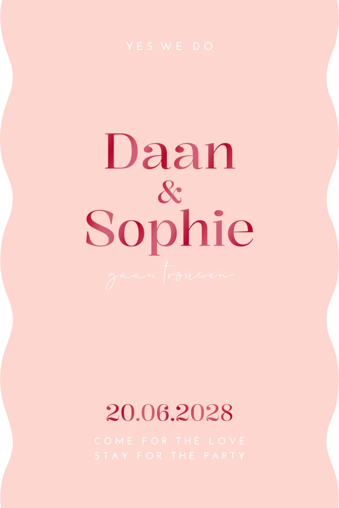 Op zoek naar een trouwkaart met een wauw-effect voor jullie bruiloft? Deze moderne trouwkaart in roe en rode tinten heeft een unieke golf vorm. De trouwkaart is afgewerkt met rode hoogglans folie. Pas de kleuren nog naar wens aan.