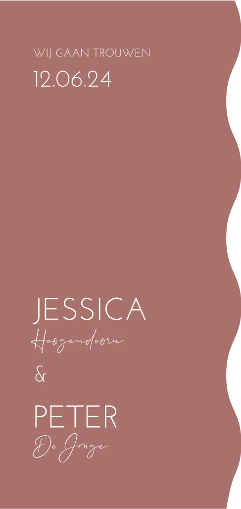 Enkele moderne trouwkaart in roest rode kleur met golf vorm. Pas de kleur van de kaart naar wens aan. TIP: voeg een extra kaartje toe met dagprogramma of een klein kaartje met foto of trouwlogo d.m.v. een paperclip.