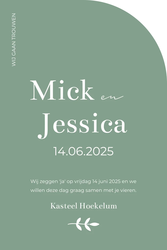 Groene minimalistische trouwkaart met boogvorm en takje. Pas de kleur van de kaart naar wens aan.
