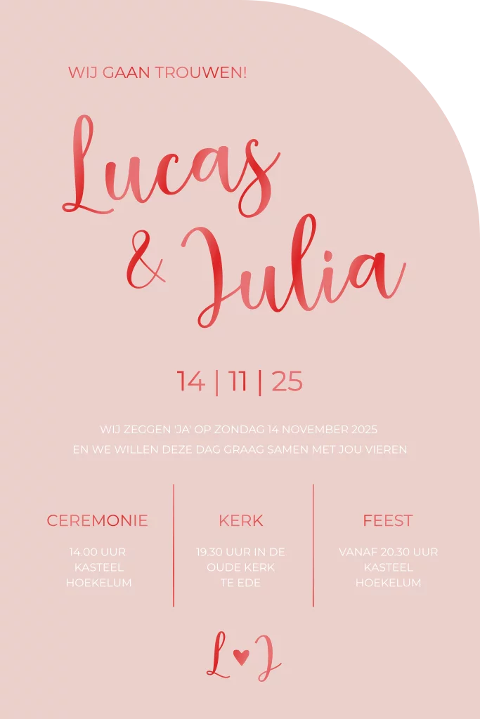 Trouwkaart vorm stans boog roze rood hoogglans modern