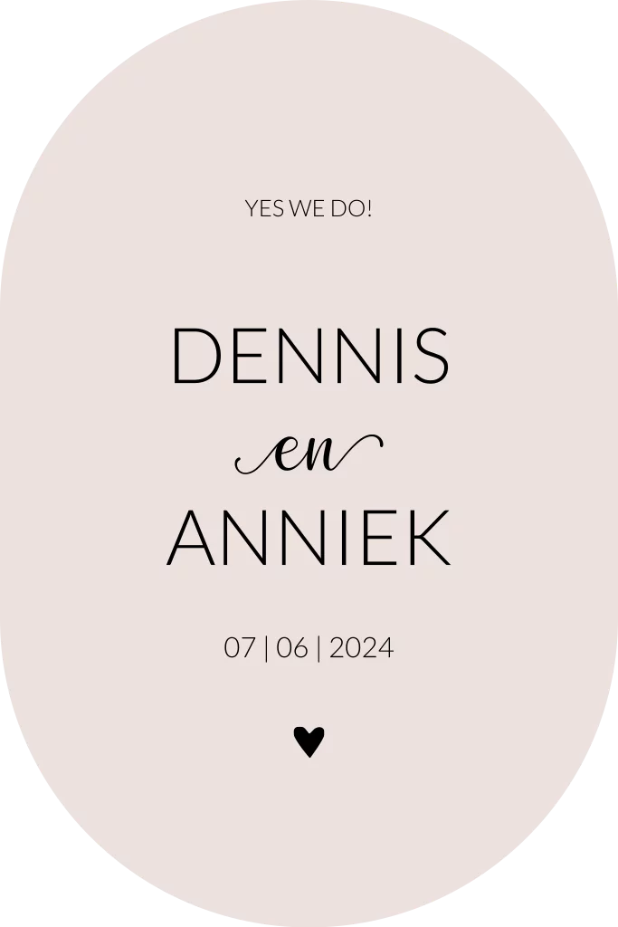 Moderne trouwkaart met lichtroze achtergrond en zwarte letters. De kaart is gestanst in een ovaal vorm, waardoor de kaart net wat specialer is. Pas de kleuren van de trouwkaart naar wens aan.