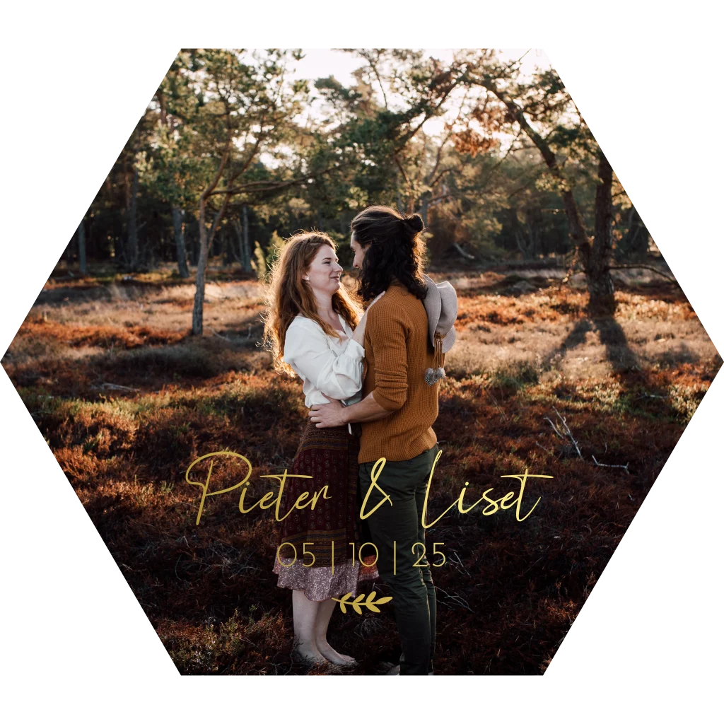 Trouwkaart zeshoek vorm met foto loveshoot en goudfolie