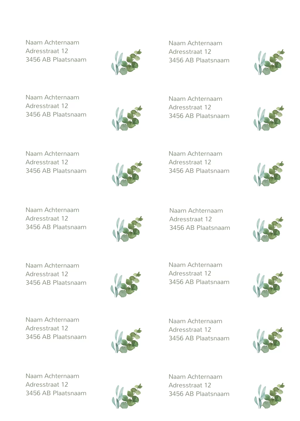 Maak zelf de adresstickers voor op de envelop van jullie trouwkaart! De adresstickers hebben een formaat van 97x34 mm en zijn afgewerkt met ronde hoeken. Er zitten 14 stuks op een vel. Deze adresstickers horen bij de trouwhuisstijl Botamnical Leaves.