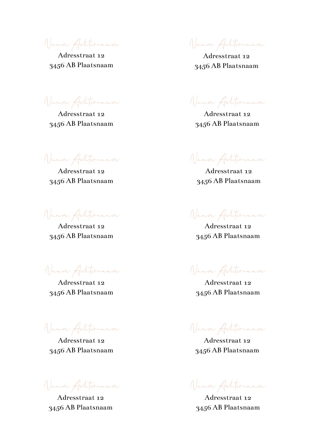 Maak zelf de adresstickers voor op de envelop van jullie trouwkaart! De adresstickers hebben een formaat van 97x34 mm en zijn afgewerkt met ronde hoeken. Er zitten 14 stuks op een vel. Deze adresstickers horen bij de trouwhuisstijl Classic leaves.