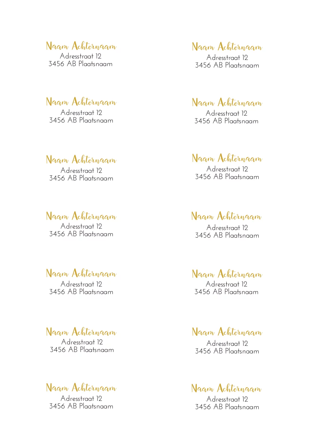 Maak zelf de adresstickers voor op de envelop van jullie trouwkaart! De adresstickers hebben een formaat van 97x34 mm en zijn afgewerkt met ronde hoeken. Er zitten 14 stuks op een vel. Deze adresstickers horen bij de trouwhuisstijl Golden Days.