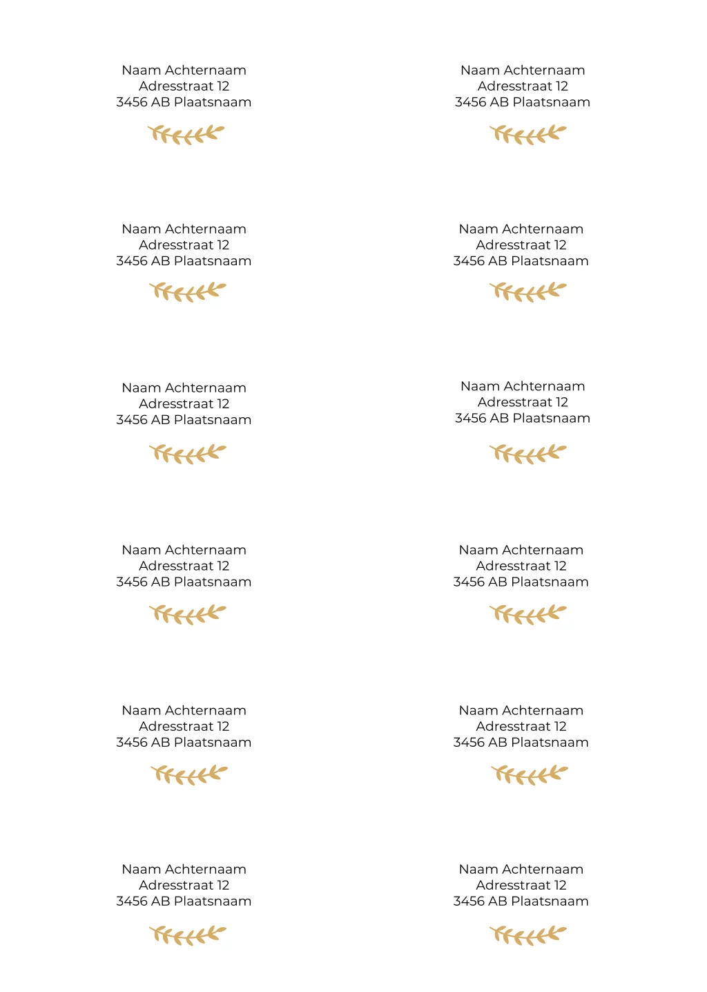 Maak zelf de adresstickers voor op de envelop van jullie kaart! De adresstickers hebben een formaat van 97x45 mm. Er zitten 12 stickers op een vel. Deze adresstickers horen bij de trouwhuisstijl Golden Love.