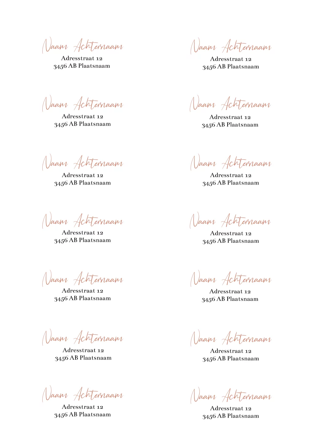 Maak zelf de adresstickers voor op de envelop van jullie trouwkaart! De adresstickers hebben een formaat van 97x34 mm en zijn afgewerkt met ronde hoeken. Er zitten 14 stuks op een vel. Deze adresstickers horen bij de trouwhuisstijl Italian Boho.| Totaalprijs: 0 |