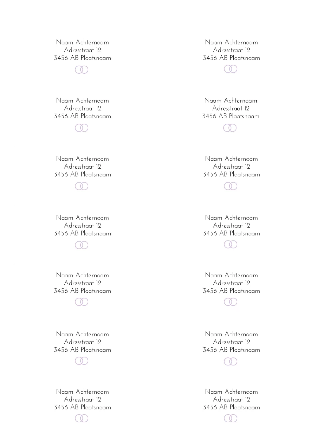 Maak zelf de adresstickers voor op de envelop van jullie trouwkaart! De adresstickers hebben een formaat van 97x34 mm en zijn afgewerkt met ronde hoeken. Er zitten 14 stuks op een vel. Deze adresstickers horen bij de trouwhuisstijl Lovely Lila.| Totaalprijs: 0 |
