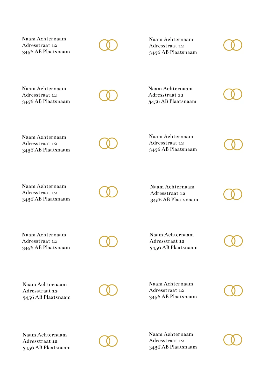 Maak zelf de adresstickers voor op de envelop van jullie trouwkaart! De adresstickers hebben een formaat van 97x34 mm en zijn afgewerkt met ronde hoeken. Er zitten 14 stuks op een vel. Deze adresstickers horen bij de trouwhuisstijl Romantic Beige.| Totaalprijs: 0 |