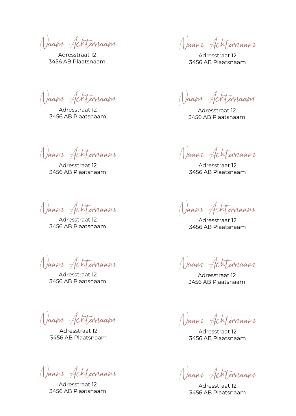 Maak zelf de adresstickers voor op de envelop van jullie trouwkaart! De adresstickers hebben een formaat van 97x34 mm en zijn afgewerkt met ronde hoeken. Er zitten 14 stuks op een vel. Deze adresstickers horen bij de trouwhuisstijl Romantic Rose.