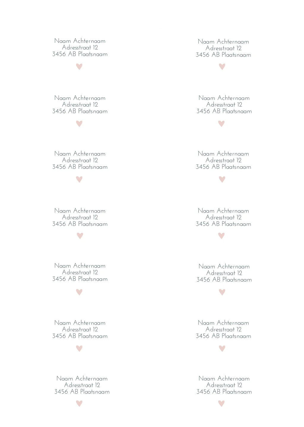 Maak zelf de adresstickers voor op de envelop van jullie trouwkaart. Deze adresstickers hebben een formaat van 97x34 mm en zijn afgewerkt met ronde hoeken. Er zitten 14 stuks op een vel. Kies vooraf het aantal vellen dat je nodig hebt. Deze adresstickers horen bij de trouwhuisstijl Blooming Love.
