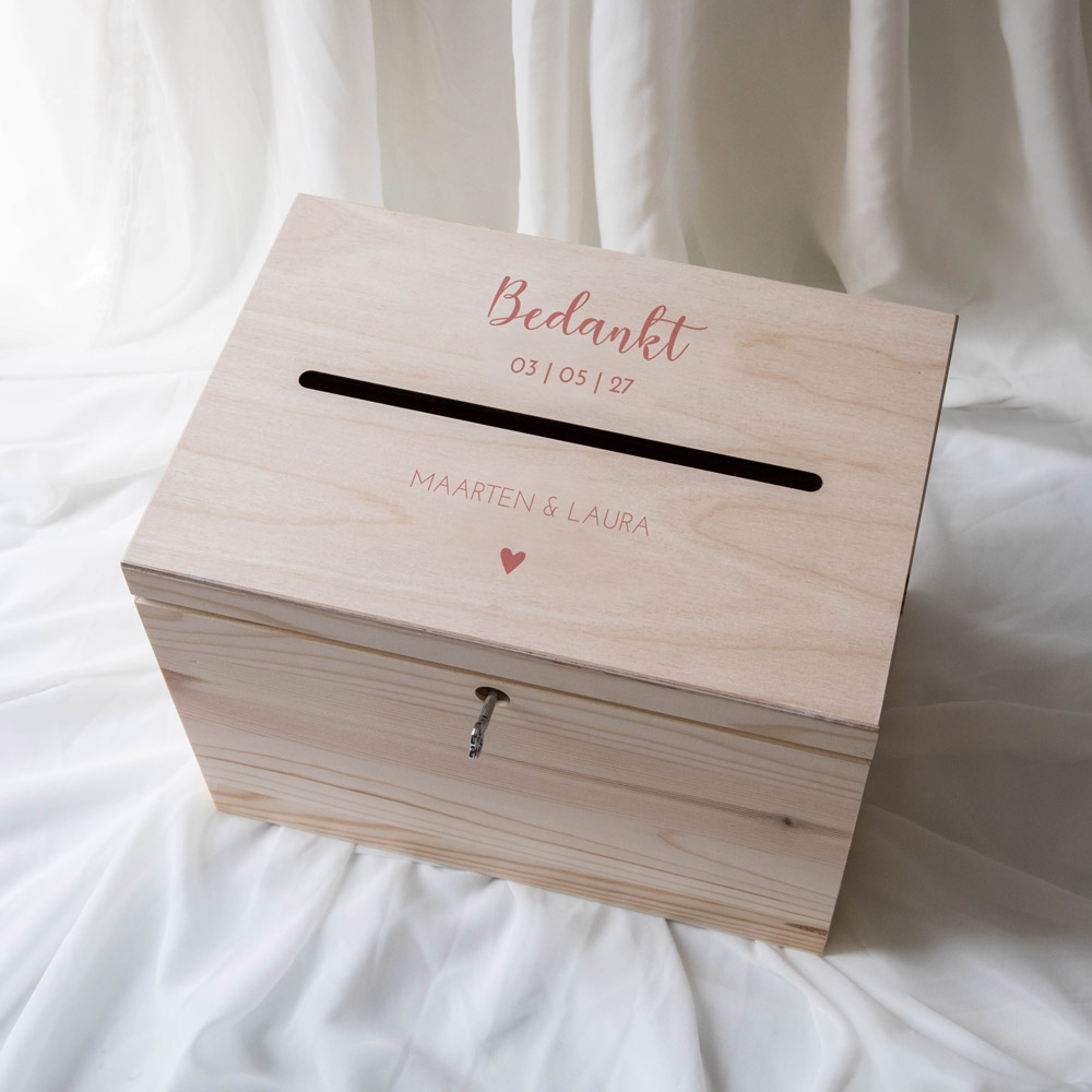 Ontwerp zelf een mooie enveloppendoos voor op jullie bruiloft. Zo kunnen de bruiloftsgasten hun wensen en envelop met geld veilig achterlaten in deze houten enveloppenkist. Formaat: 20 x 29 x 22 cm, gleuf 21 cm.| Totaalprijs: 0 |