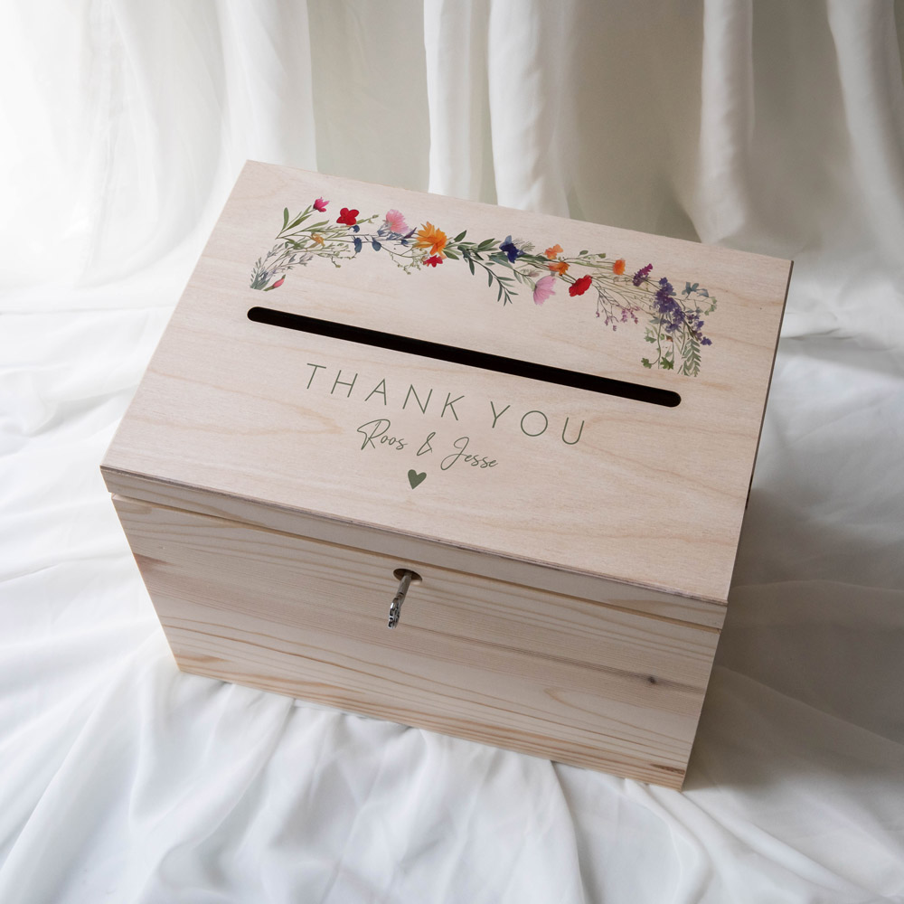 Ontwerp zelf een mooie enveloppendoos voor op jullie bruiloft. Zo kunnen de bruiloftsgasten hun wensen en envelop met geld veilig achterlaten in deze houten enveloppenkist. Formaat: 20 x 29 x 22 cm, gleuf 21 cm.