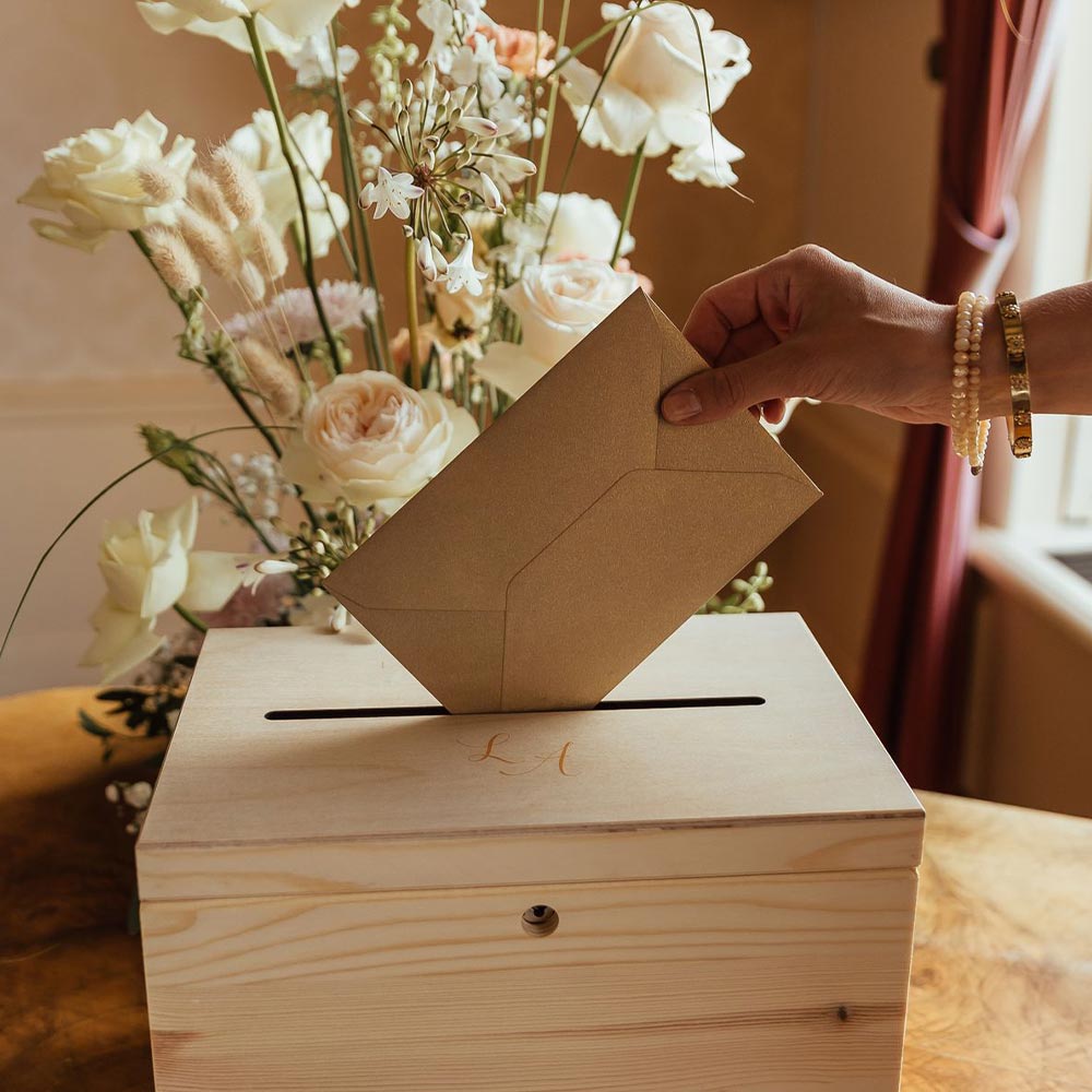 Ontwerp zelf een mooie enveloppendoos voor op jullie bruiloft. Zo kunnen de bruiloftsgasten hun wensen en envelop met geld veilig achterlaten in deze houten enveloppenkist. Formaat: 20 x 29 x 22 cm, gleuf 21 cm. Thema: Timeless Elegance. Fotografie: Jessica v.d. Berg
