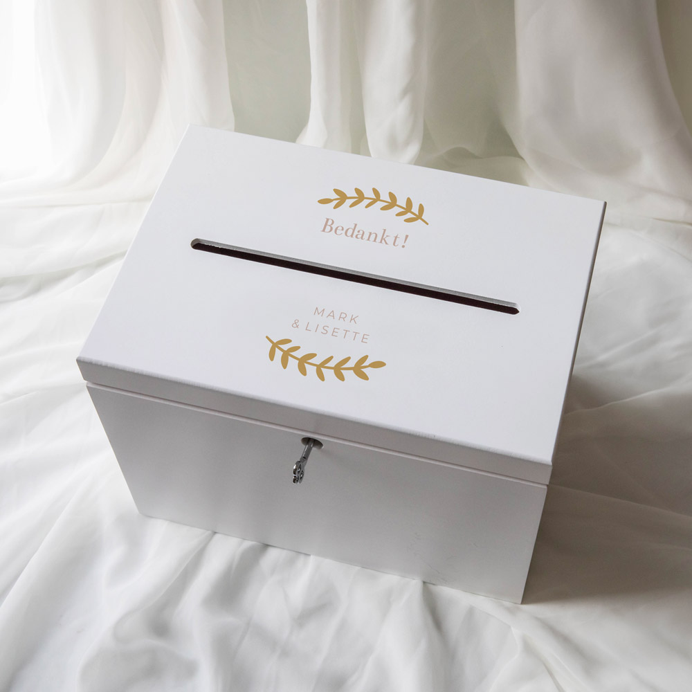 Ontwerp zelf een mooie enveloppendoos voor op jullie bruiloft. Zo kunnen de bruiloftsgasten hun wensen en envelop met geld veilig achterlaten in deze houten enveloppenkist. Formaat: 20 x 29 x 22 cm, gleuf 21 cm.