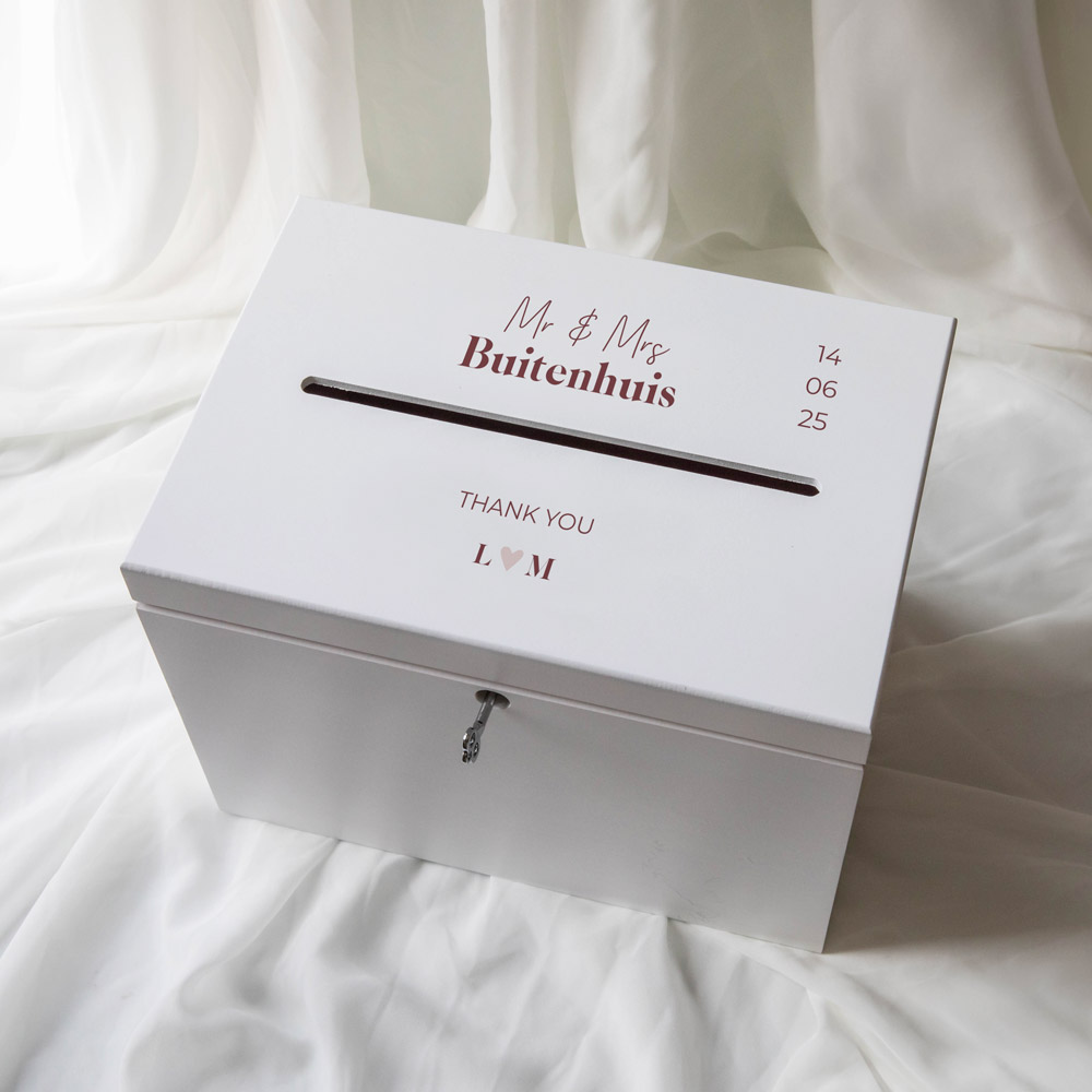 Ontwerp zelf een mooie enveloppendoos voor op jullie bruiloft. Zo kunnen de bruiloftsgasten hun wensen en envelop met geld veilig achterlaten in deze houten enveloppenkist. Formaat: 20 x 29 x 22 cm, gleuf 21 cm.| Totaalprijs: 0 |