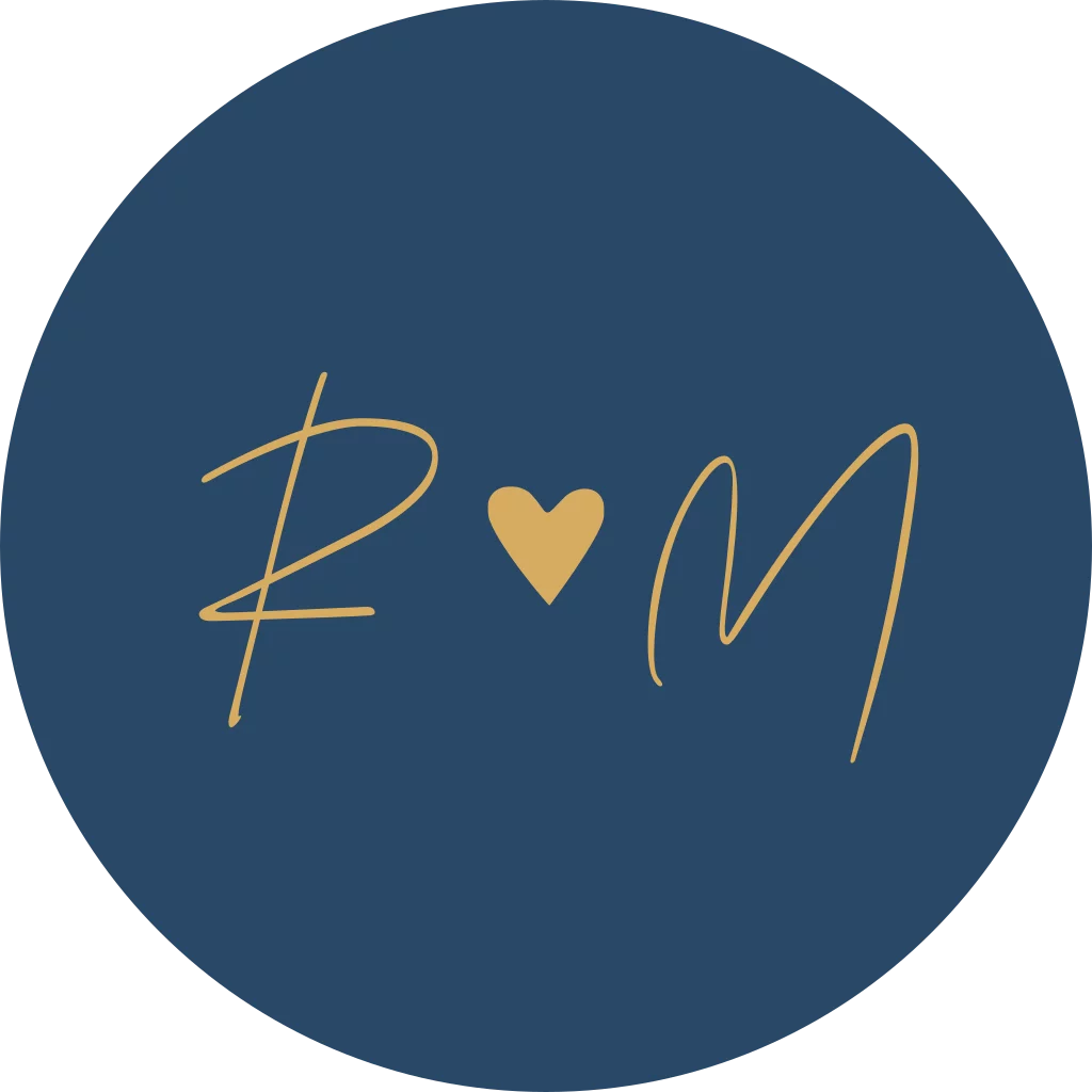 Sluitsticker trouwkaart Robin & Martine blauw initialen goud