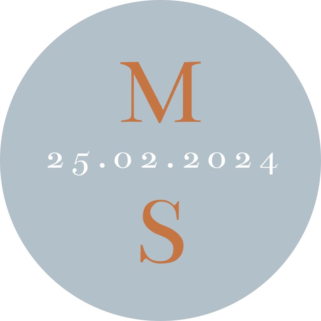 Ontwerp je eigen sluitsticker voor op de envelop in de stijl van de trouwkaart! Deze sticker heeft een blauwe achtergrond, initialen in de kleur roest bruin en de trouwdatum in het wit. Pas de kleuren van de sticker zelf naar wens aan.