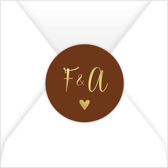 Een roest rode sluitsticker met hartje en initialen in goudfolie. Deze sluitzegel kun je op de envelop van de trouwkaart passen. Zo is al het drukwerk helemaal in dezelfde stijl!