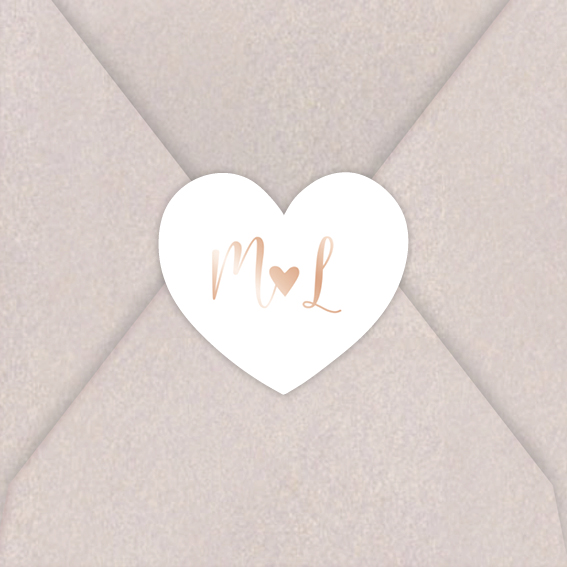 Een sticker voor bij de trouwkaart in de vorm van een hartje. Op deze sluitsticker staan initialen met een hartje, zo heb je een prachtig trouwlogo! De sticker is afgewerkt met glimmende rosefolie.