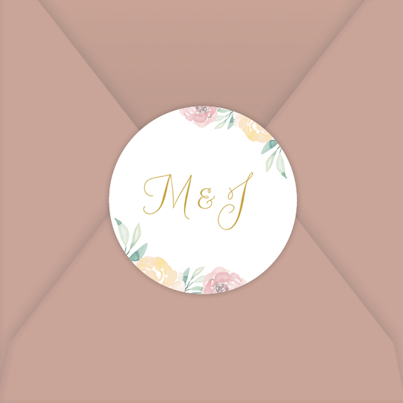 Ontwerp je eigen sluitsticker voor op de envelop in de stijl van de trouwkaart! Deze sticker heeft een witte achtergrond met initialen en bloemen. Pas de kleuren van de sticker zelf naar wens aan.
