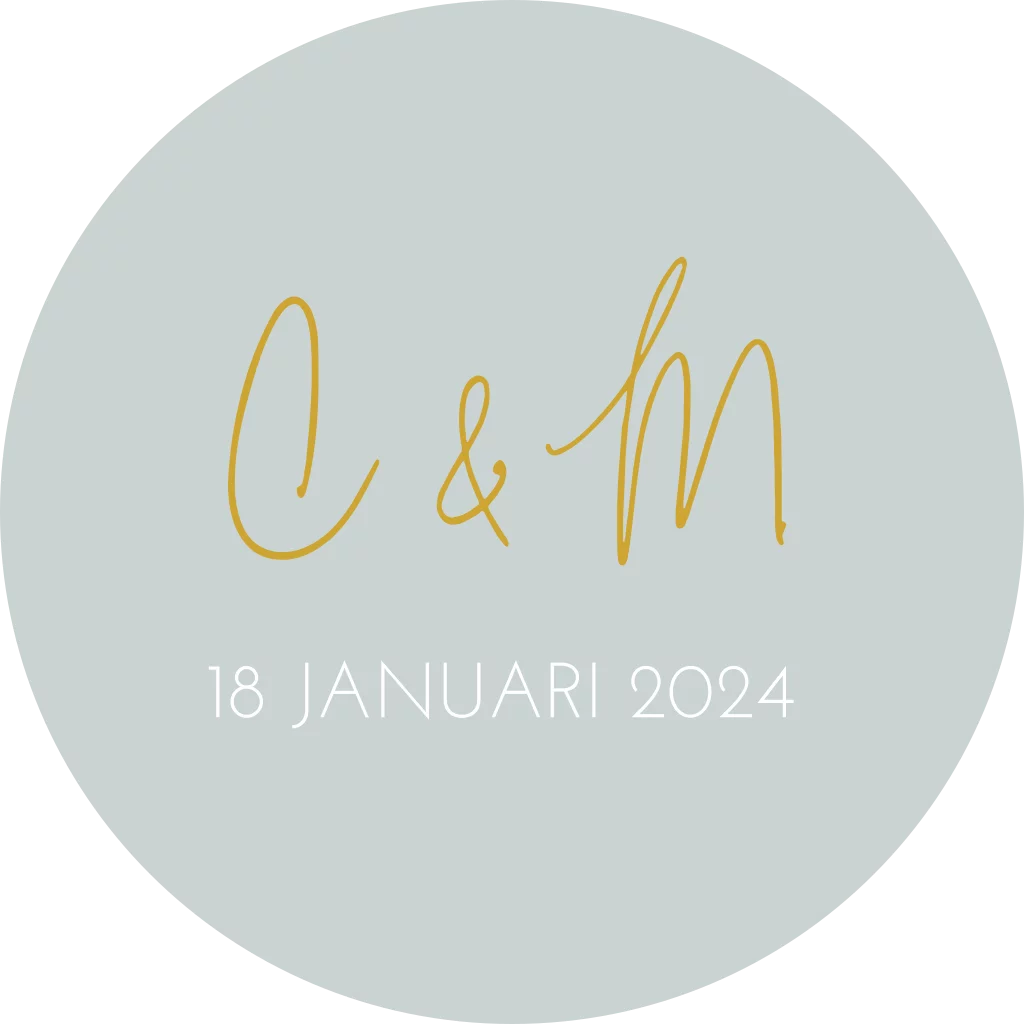 Ontwerp je eigen sluitsticker voor op de envelop in de stijl van de trouwkaart! Deze sticker heeft een mintgroene achtergrond met de initialen van het bruidspaar in het goud en de trouwdatum in het wit. Pas de kleuren van de sticker zelf naar wens aan.