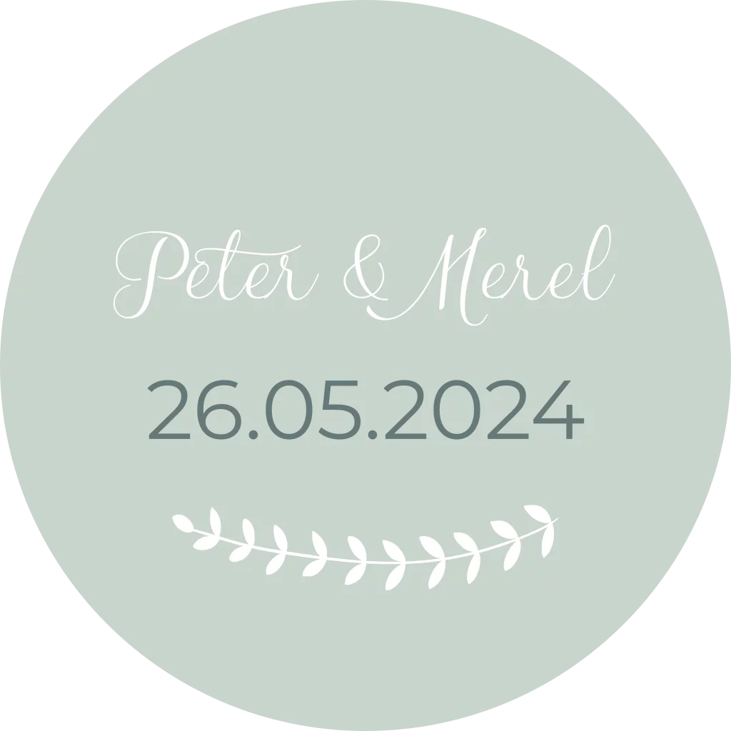 Een mooie mintgroene sluitsticker met sierlijke letters, trouwdatum en een takje. Deze sluitzegel past bij een trouwkaart uit de collectie, zodat alles voor jullie bruiloft mooi bij elkaar matcht!