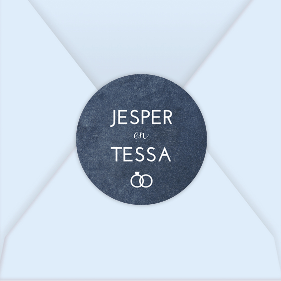 Ontwerp je eigen sluitsticker voor op de envelop in de stijl van de trouwkaart! Deze sticker heeft een velvet look achtergrond met namen en trouwringen. Pas de kleuren van de sticker zelf naar wens aan.