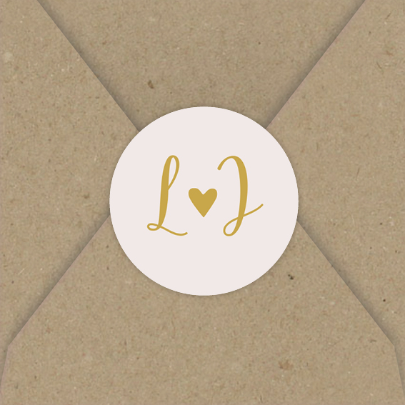 Ontwerp je eigen sluitsticker voor op de envelop in de stijl van de trouwkaart! Deze sticker heeft een roze achtergrond met initialen en een hartje. Pas de kleuren van de sticker zelf naar wens aan.