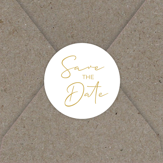 Deze sluitsticker heeft sierlijke goudkleurige letters ‘Save The Date’. Pas de kleuren naar wens aan in de editor, om te laten aansluiten op de trouwhuisstijl.
