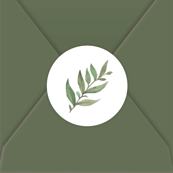 Ontwerp je eigen sluitsticker voor op de envelop in de stijl van de trouwkaart! Deze sticker heeft een witte achtergrond met een groen takje. Pas de kleuren van de sticker zelf naar wens aan.