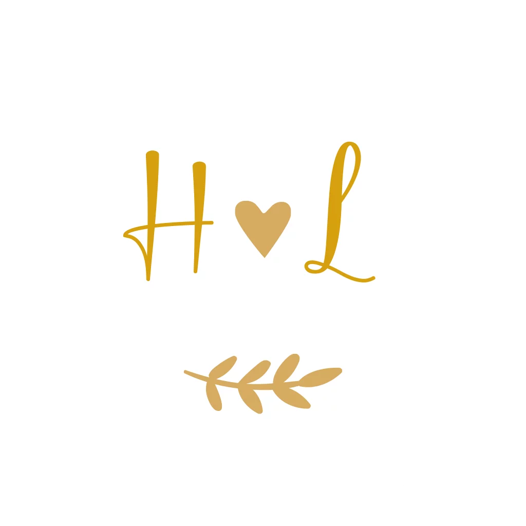 Ontwerp je eigen sluitsticker voor op de envelop in de stijl van de trouwkaart! Deze sticker heeft een witte achtergrond, gouden takje en de initialen in sierlijke letters. Pas de kleuren van de sticker zelf naar wens aan.