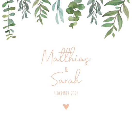 Een leuk tegeltje in dezelfde stijl als jullie trouwkaart. Het tegeltje heeft het formaat 15x15 cm en is nog helemaal naar wens aan te passen. Passend bij de trouwhuisstijl Botanical Leaves.