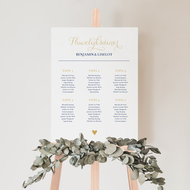 Een echte must-have voor bij het diner van jullie bruiloft: een tafelschikking bord! Dit bord heeft chique letters, een witte achtergrond en donkerblauwe met gouden tekst. Gedrukt op 5 mm dik forex en het bord is weerbestendig. Je kunt het tafelschikking bord helemaal aan in de stijl van jullie trouwkaart maken. Op een bruiloftsbord kan geen folie worden gedrukt.