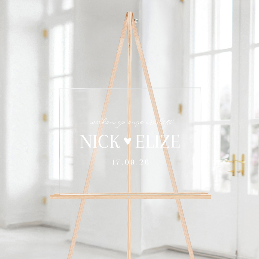 Een modern welkomstbord met witte letters en een hartje gedrukt op transparant acryl. Met een bruiloftsbord maak je de styling op jullie bruiloft helemaal af! Dit bord wordt gedrukt op 5 mm dik plexiglas.