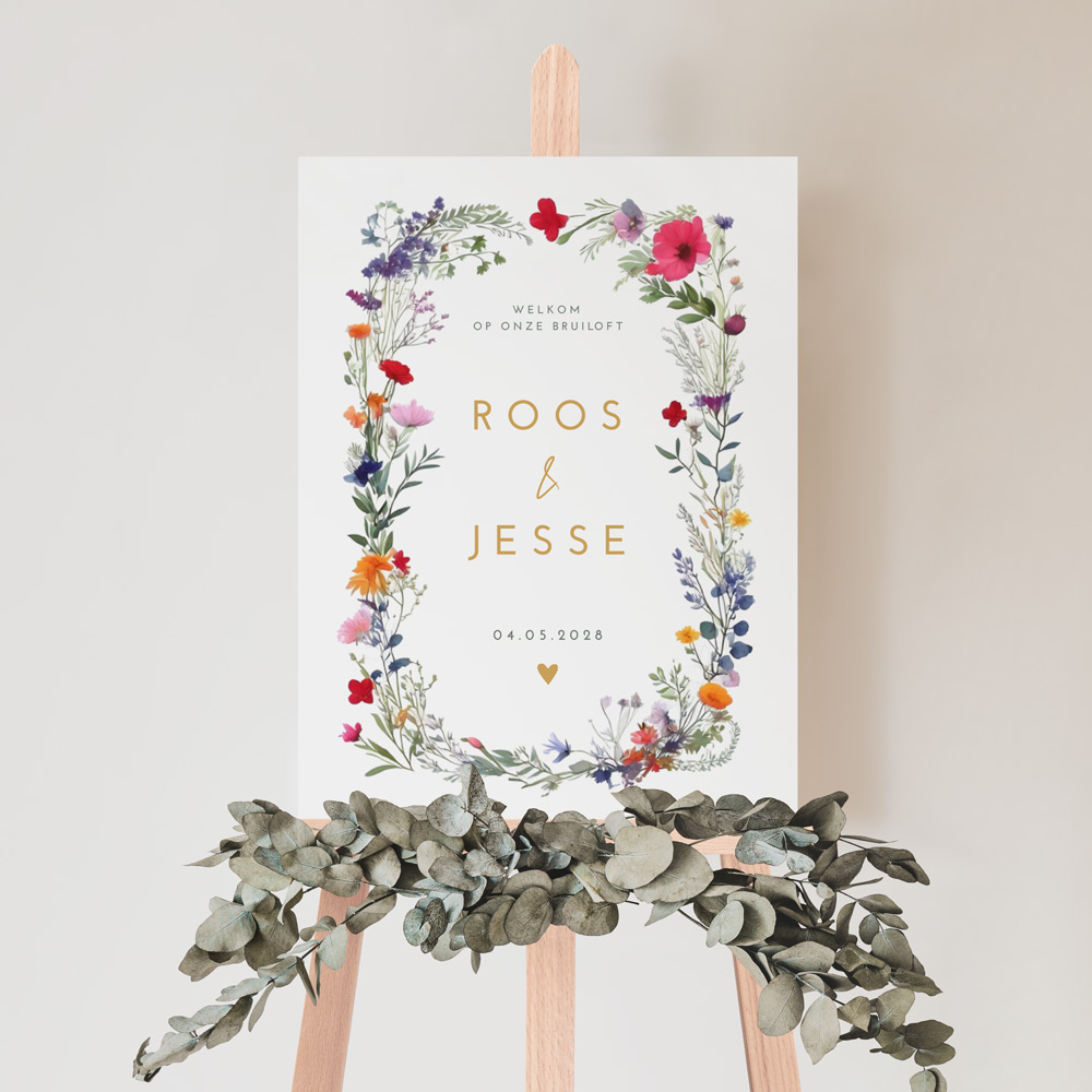 Een romantisch welkomstbord met een rand van kleurrijke bloemen. Het trouwbord wordt gedrukt op 5 mm dik forex en is weerbestendig. Op een welkomstbord kan geen folie worden gedrukt.