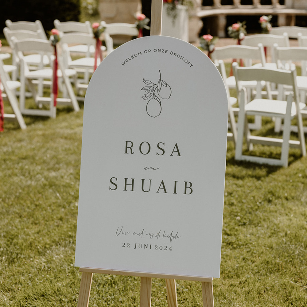 Een uniek welkomstbord met een boogvorm: helemaal volgens die laatste trends! Dit bord heeft een Italiaans tintje met getekende citroenen. Perfect voor een destination wedding in Italië. Materiaal: 5 mm dik forex en weerbestendig. Op een welkomstbord kan geen folie worden gedrukt.