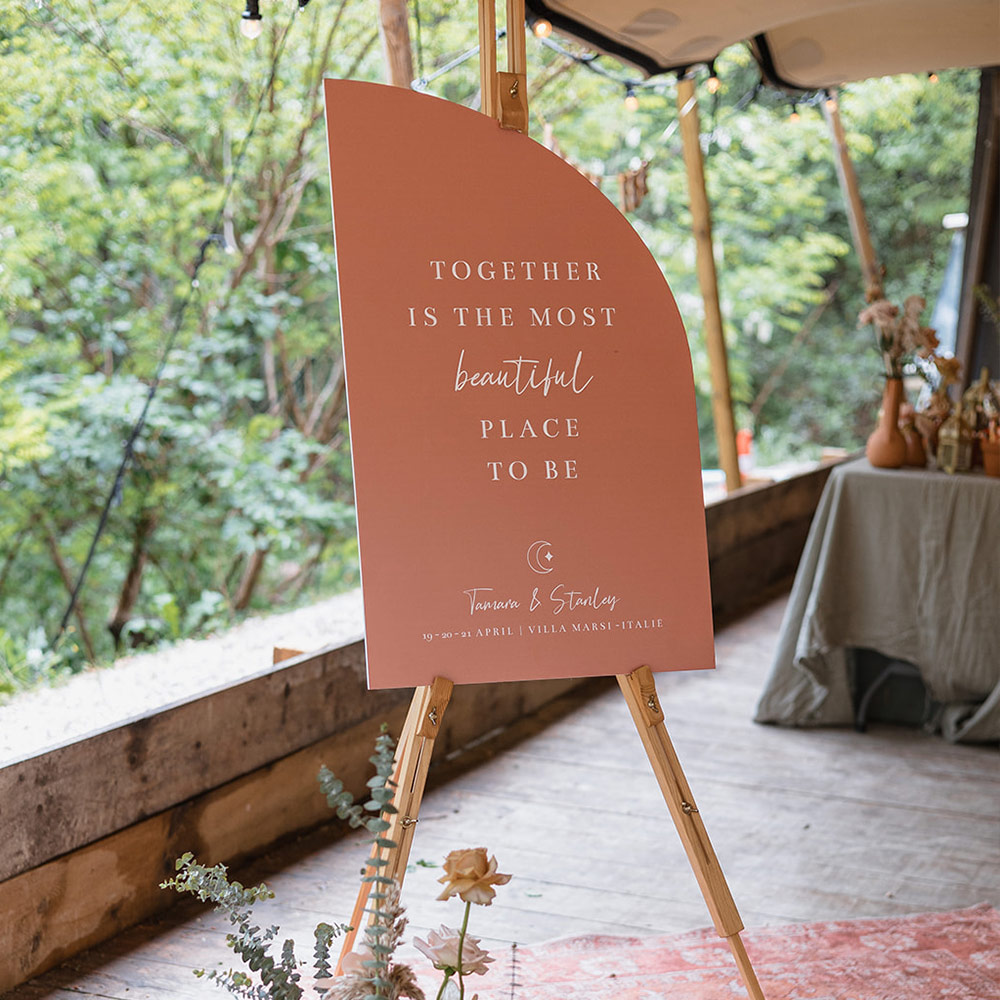 Wauw! Dit welkomstbord is een echte eye catcher op jullie bruiloft! Pas het bord nog helemaal naar wens aan in de stijl van de trouwkaart. Het bruiloftsbord heeft een halve boog en is weerbestendig. Materiaal: 5 mm dik forex. Trouwhuisstijl: Italian Boho