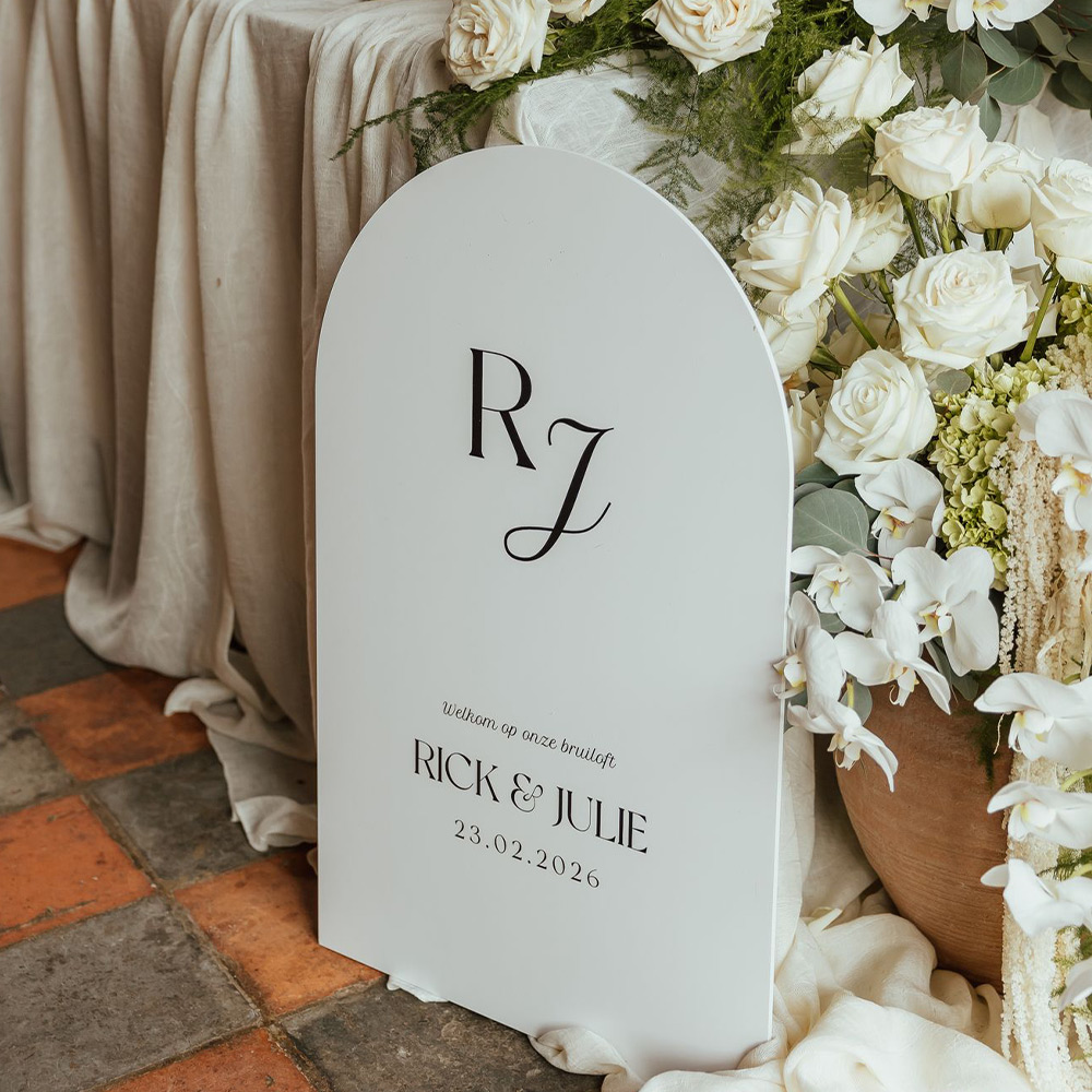 Wauw! Een modern welkomstbord met boogvorm helemaal volgens de laatste trends! Dit bord heeft een witte achtergrond, trouwlogo monogram en zwarte letters. Materiaal: 5 mm dik forex en weerbestendig. Pas het bruiloftsbord helemaal aan in de stijl van jullie trouwkaart. Fotografie: Jessica v.d. Berg