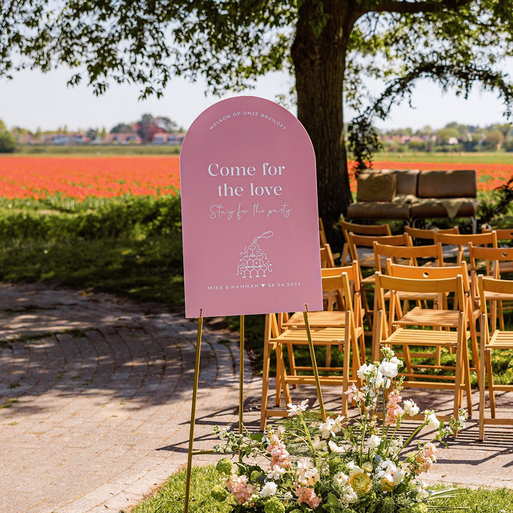 Een uniek welkomstbord met een boogvorm: helemaal volgens de laatste trends! Dit bord heeft een getekende champagnetoren en een roze achtergrond, maar je kunt in de editor de kleuren en lettertypes nog naar wens aanpassen. Zo past het bord mooi bij jullie trouwkaart en is het een geheel! Materiaal: 5 mm dik forex en weerbestendig. Op een welkomstbord kan geen folie worden gedrukt. Fotografie: Lisan Spiegelaar