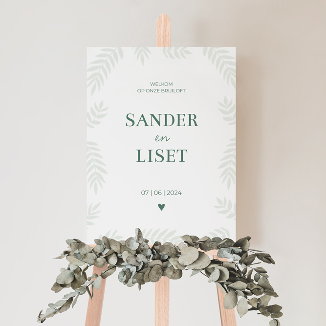 Hoe leuk: een welkomstbord helemaal in stijl van jullie trouwkaart! Dit trouwbord heeft een botanische stijl met een rand van bladeren. Het trouwbord is van weerbestendig materiaal en wordt gedrukt op 5 mm dik forex. Op een welkomstbord kan geen folie worden gedrukt.