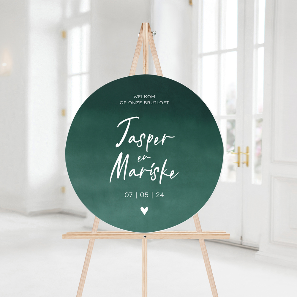 Een rond welkomstbord voor jullie bruiloft in ronde met groene watercolor achtergrond. Super leuk als het bord bij jullie trouwkaart past! Het trouwbord wordt gedrukt op 5 mm dik forex en is weerbestendig. Op een welkomstbord kan geen folie worden gedrukt.