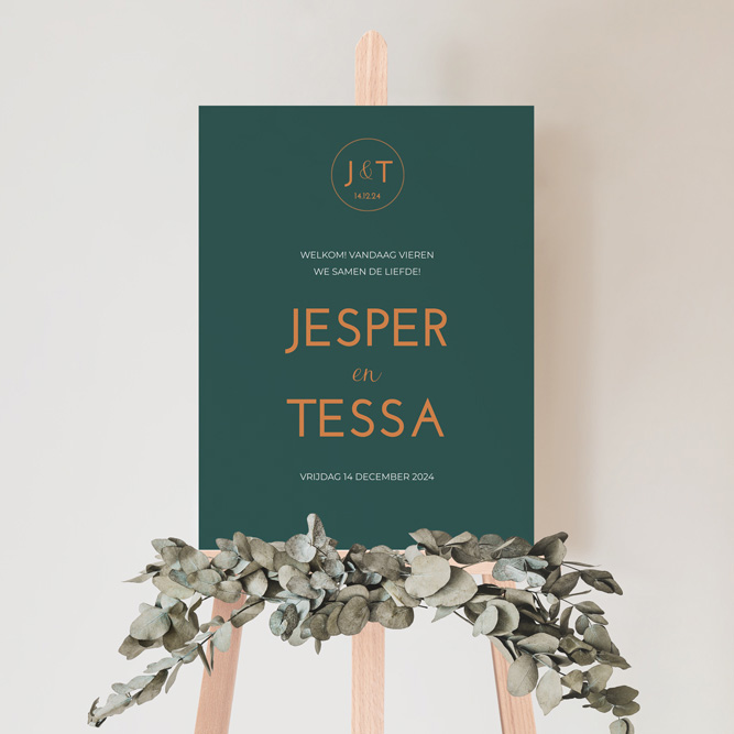 Welkomstbord bruiloft donkergroen trouwlogo koper