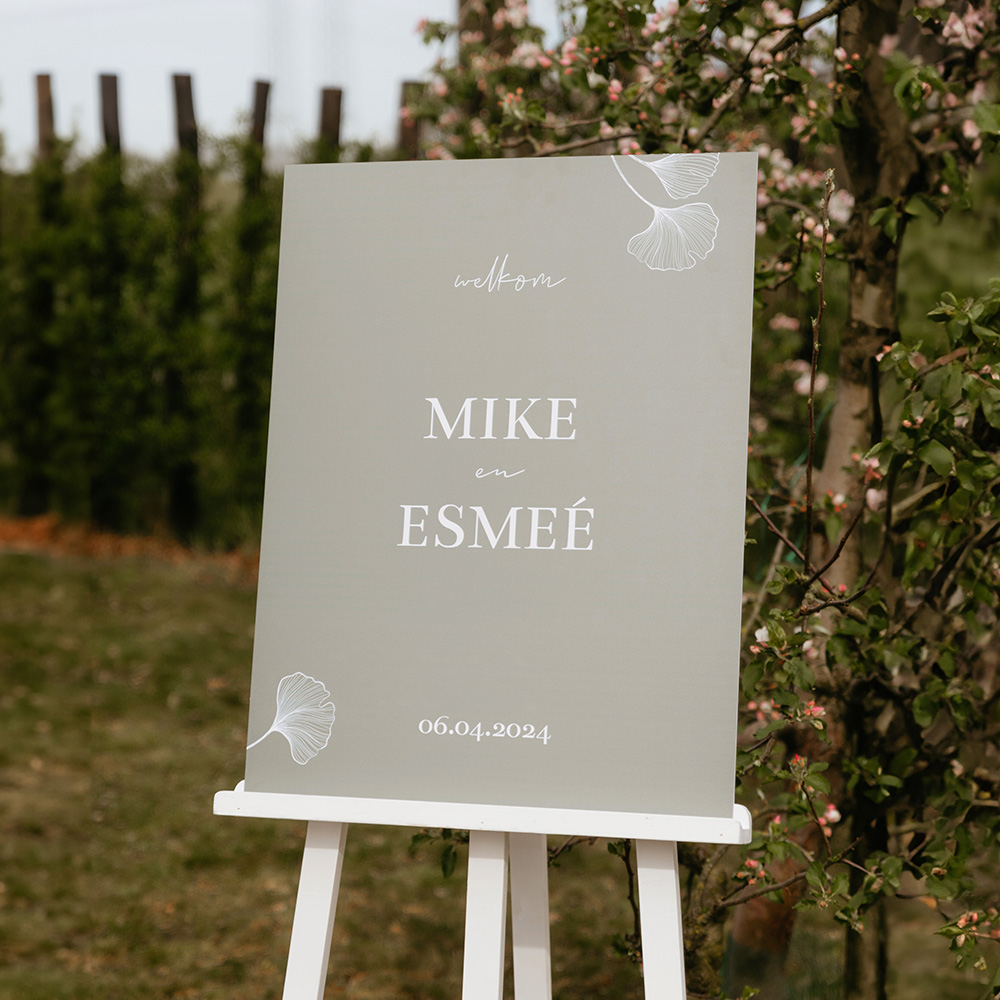 Super leuk: een mooi welkomstbord voor op jullie bruiloft! En helemaal leuk als het bord in de stijl van jullie trouwkaart is. Je kunt de kleuren en lettertypes nog aanpassen in de editor. Dit bord heeft een witte achtergrond met sierlijke letters en is weerbestendig. Gedrukt op 5 mm dik forex. Op een welkomstbord kan geen folie worden gedrukt. Fotografie: Nikki Ickx Fotografie