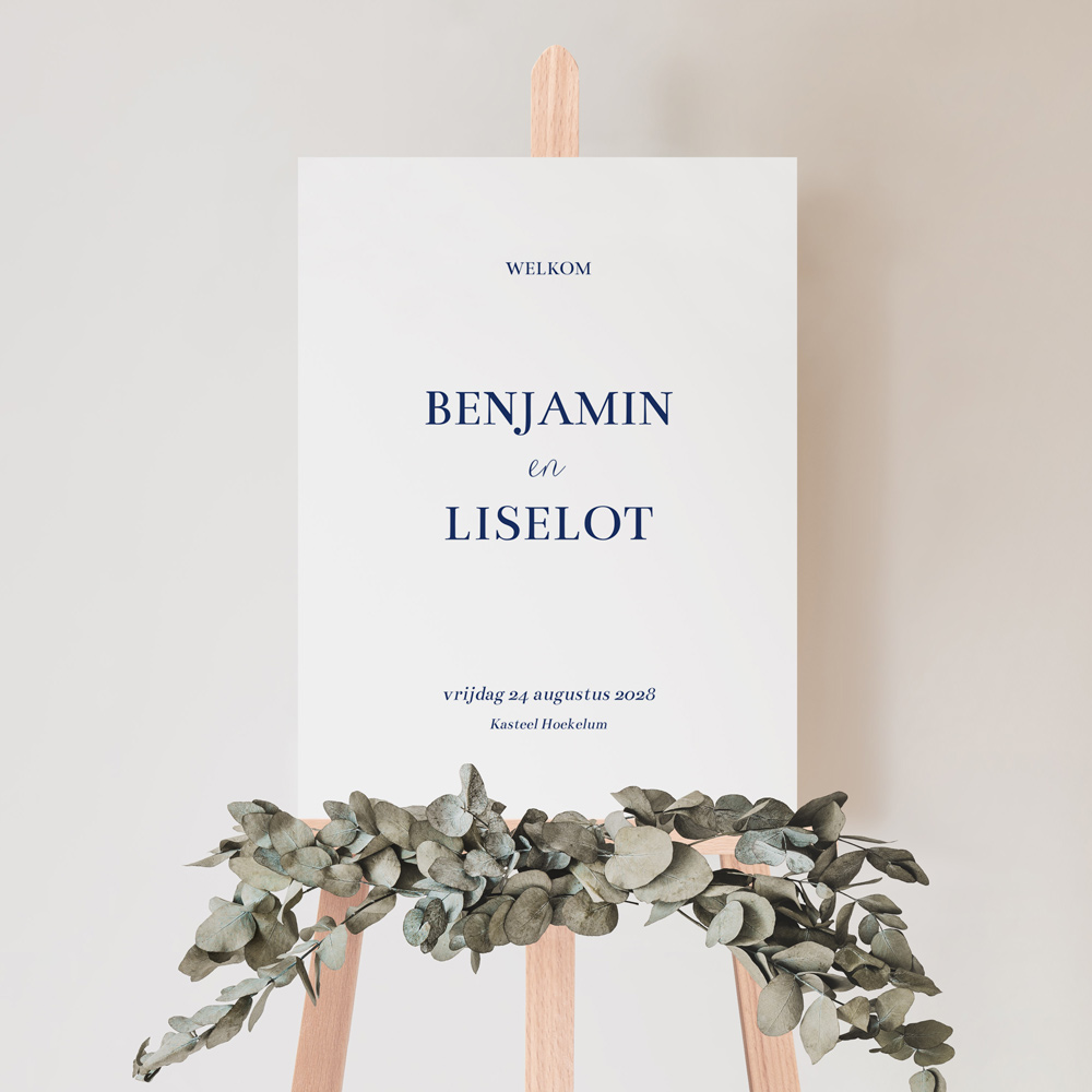 Een klassiek welkomstbord met witte achtergrond en donkerblauwe letters voor jullie bruiloft. Bewerk het bord nog naar wens. Het bruiloftsbord wordt gedrukt op 5 mm dik forex materiaal.