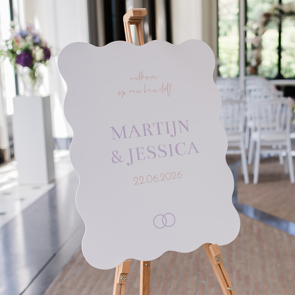 Uniek en modern welkomstbord met golfvorm en trendkleuren lila en oranje. Pas het bruiloftsbord nog naar wens aan in de stijl van jullie bruiloft, zodat alles mooi bij elkaar past - Fotografie: Laura de Borst Fotografie