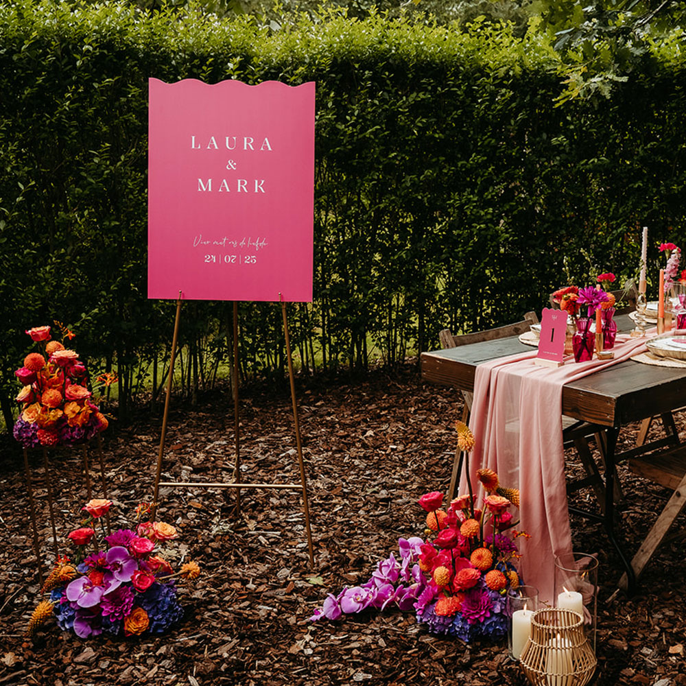 Uniek en modern welkomstbord met golfvorm in knal roze kleur. Pas het bruiloftsbord nog naar wens aan in de stijl van jullie bruiloft, zodat alles mooi bij elkaar past.| Totaalprijs: 0 |