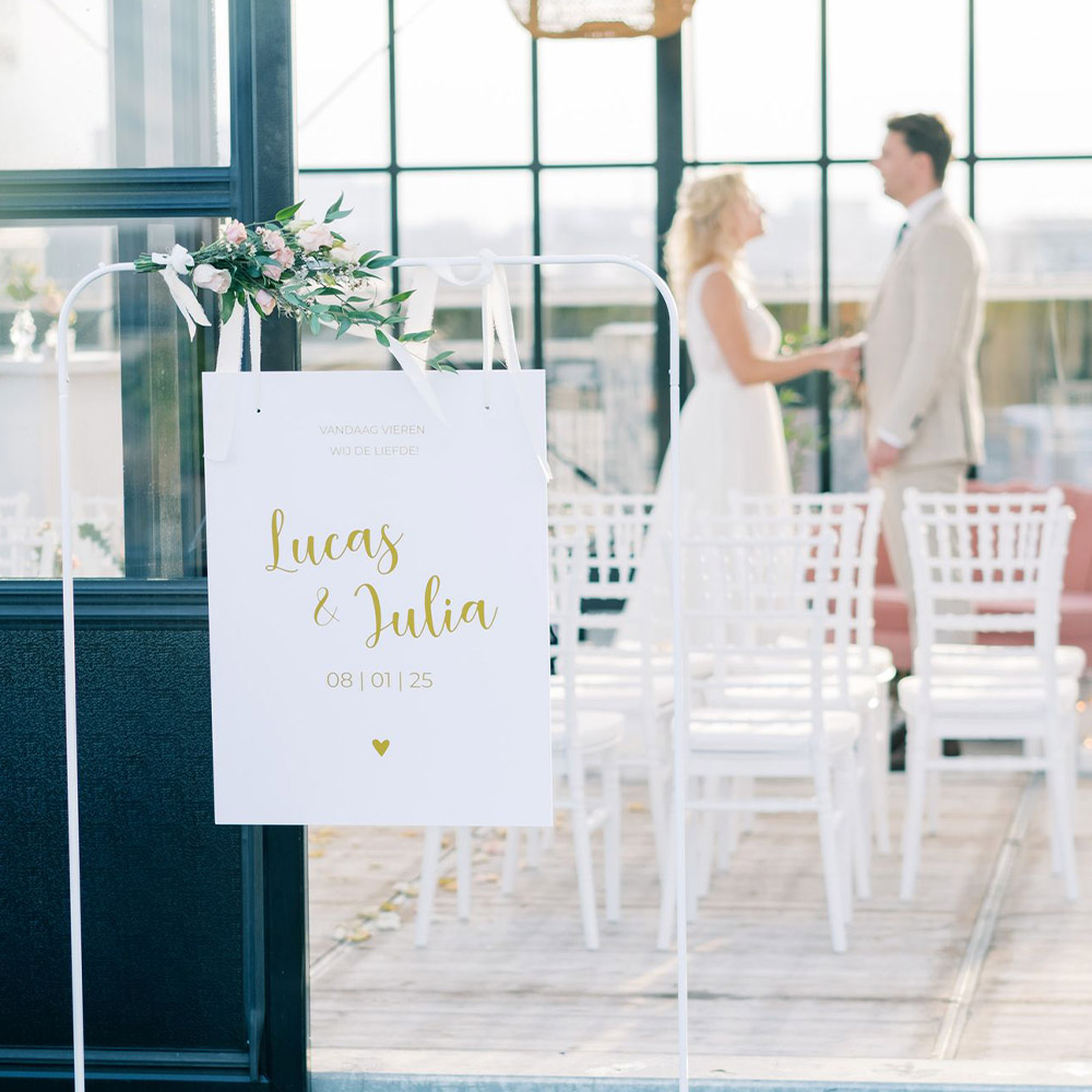 Wauw! Met een welkomstbord geef je de gasten op jullie bruiloft een warm welkom! In dezelfde stijl als de trouwkaart, dat maakt het plaatje helemaal compleet! Dit welkomstbord heeft een witte achtergrond met sierlijke letters, maar je kunt het bord nog naar wens aanpassen. Materiaal: 5 mm dik forex en weerbestendig. Op een welkomstbord kan geen folie worden gedrukt. Fotografie: van Zijp Fotografie