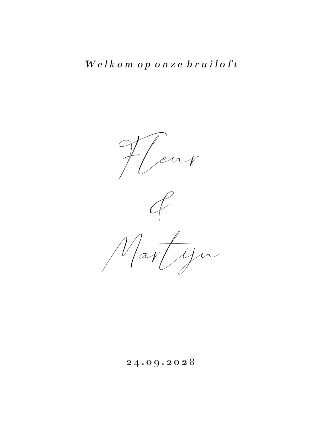 Wauw! Met een welkomstbord geef je de gasten op jullie bruiloft een warm welkom! In dezelfde stijl als de trouwkaart, dat maakt het plaatje helemaal compleet! Dit welkomstbord heeft een witte achtergrond met sierlijke letters, maar je kunt het bord nog naar wens aanpassen. Materiaal: 5 mm dik forex en weerbestendig. Op een welkomstbord kan geen folie worden gedrukt. Passend bij de trouwhuisstijl Eternal Elegance.