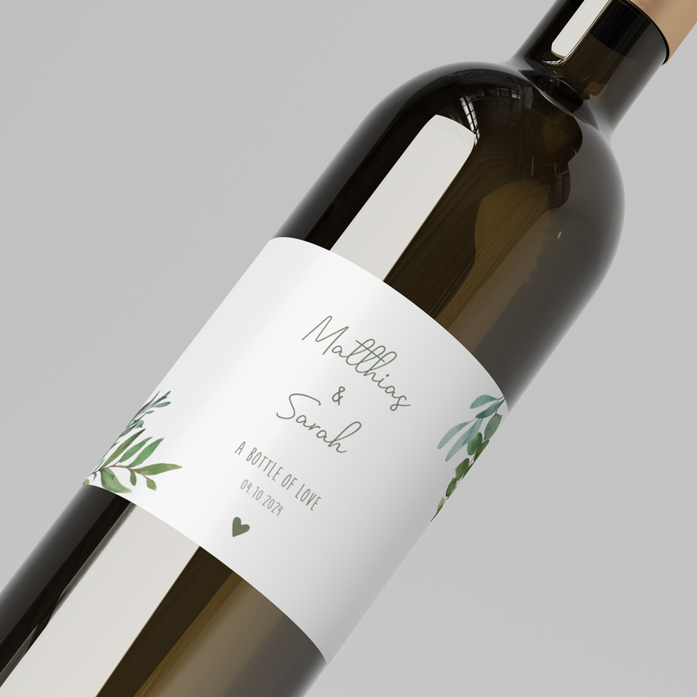 Wijnetiket voor op een fles als bedankje aan de gasten van jullie bruiloft. Formaat: liggend11x8 cm. Dit etiket hoort bij de trouwhuisstijl Botanical leaves.